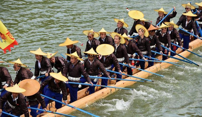 近日,苗族群众在贵州省台江县施洞镇清水江上赛独木龙舟。当日,贵州省黔东南苗族侗族自治州台江县一年一度的“苗族独木龙舟节”在该县施洞镇举行。来自清水江沿岸的苗族群众欢聚一堂,共度传统民族节日。