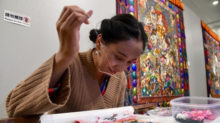 6月30日,为庆祝国庆70周年、香港回归祖国22周年,香港各界庆典委员会在全香港举行多个大型庆祝活动,其中“青海唐卡绘画艺术精品展”于香港中央图书馆举行开幕典礼,与全香港市民一同庆祝国家与香港的盛事。现场展示70多幅唐卡精品、藏族特色文化产品等,并有国家级非遗传承人现场制作唐卡,藏绣、银铜器,藏族黑陶等。图为唐卡艺术家现场制作唐卡。