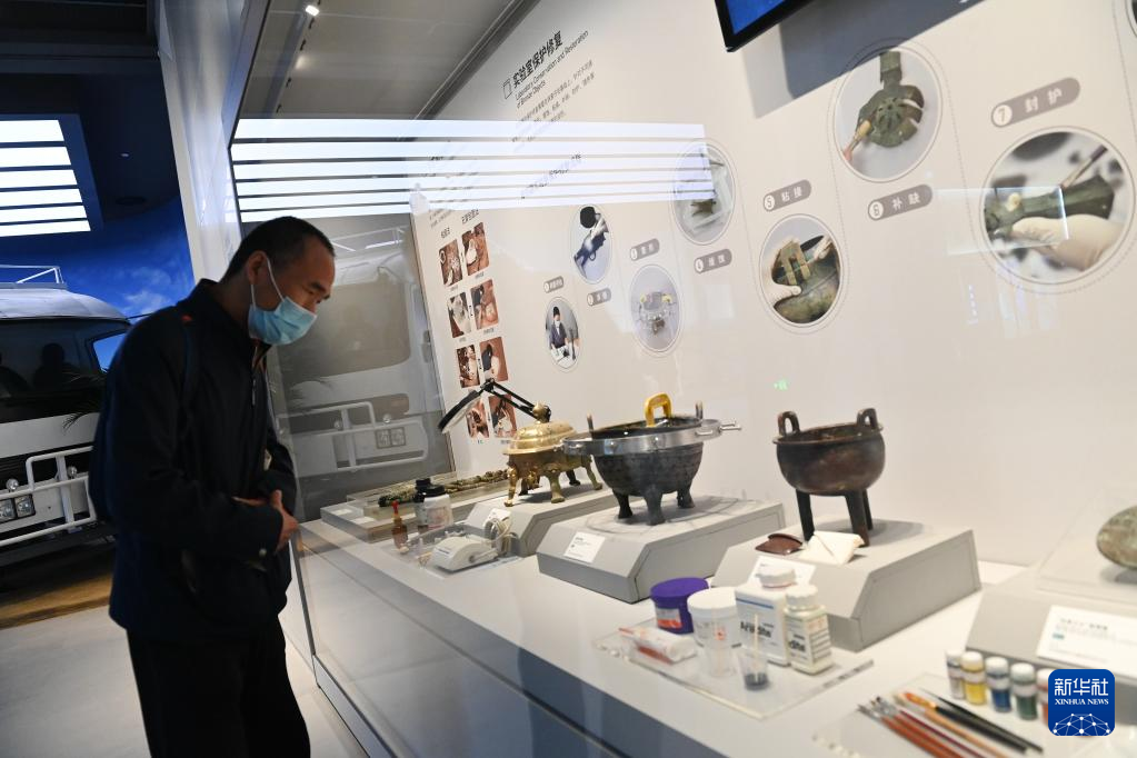 4月28日,游客在陕西考古博物馆内参观考古现场文物保护移动实验室。