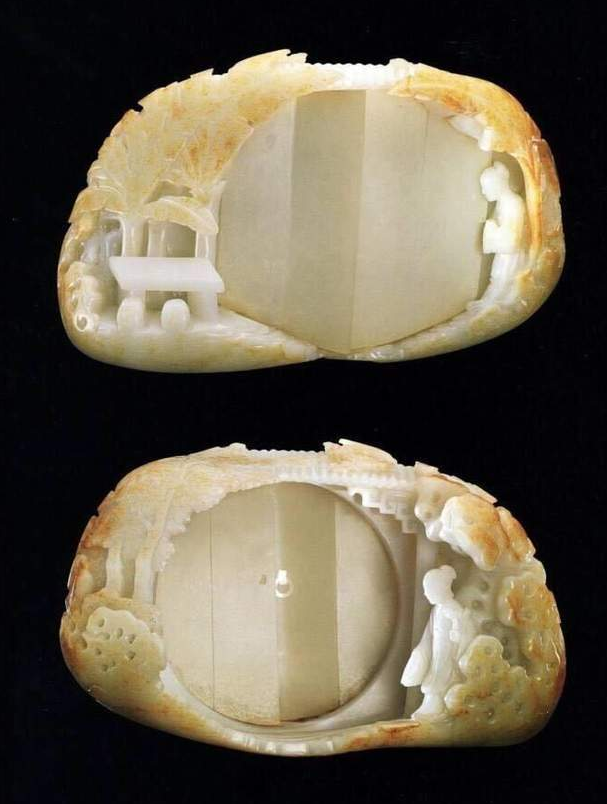 这件玉山子在制作中,也巧妙地融合了油画的透视法。以圆形的月门为界,把庭院分为前后两部分,月门半掩,门内女子手执宝瓶,门外女子手持灵芝,两人仿佛隔门相顾,窃窃私语。 四周装饰着石桌、石凳、蕉树。树叶掩映着屋檐的圆筒瓦,整体参差错落、颇具纵深感。