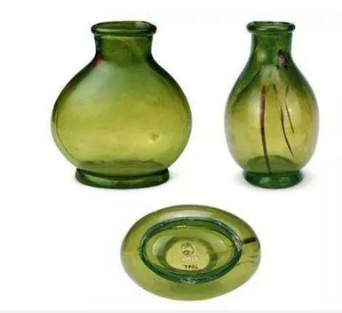 这个小而灵巧可爱的绿玻璃瓶就出土自李静训墓。该器器身、器口均为椭圆形,是由吹制法制成的,又以玻璃条缠足沿、口沿,器壁极薄,剔透晶莹。