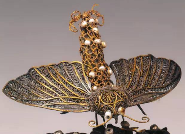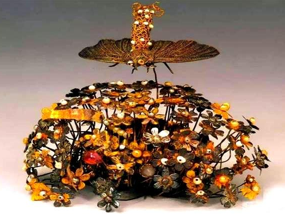 画像中精妙绝伦的闹蛾扑花冠也是确有其物,出土时位于墓主人头骨处。