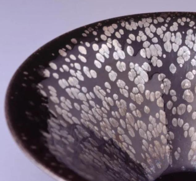 如同鹧鸪身上羽毛斑点纹理的,宋人称为“鹧鸪斑”,日本人认为像沸腾油滴散落碗内,也称为“油滴纹”,斑纹有大有小,有疏有密,有“金油滴”“银油滴”的区别。