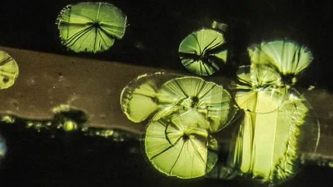 橄榄石内部,有特有的荷叶状内含物群,由黑色铬铁矿、深红褐色铬尖晶石、负晶、盘状应力纹和气液包裹体等共同组成,在10倍放大镜下可以看见。