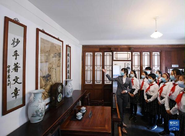 北京李大钊故居的讲解员为前来参观的学生做介绍(6月1日摄)。新华社记者 张晨霖 摄