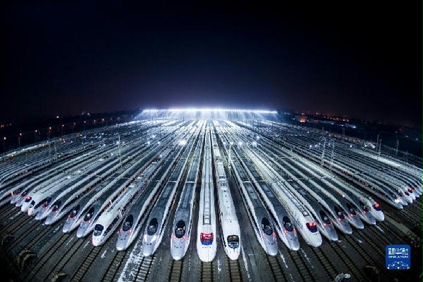 动车组停靠在武汉动车段的存车线上,准备进行检修和保温作业(2018年2月1日摄)。新华社记者 肖艺九 摄