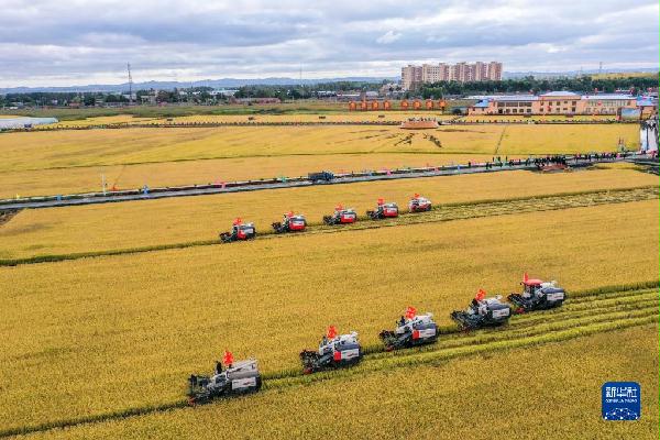 在吉林省长春市九台区龙嘉街道红光村,农民驾驶农机进行水稻收割作业(9月23日摄,无人机照片)。新华社记者 张楠 摄