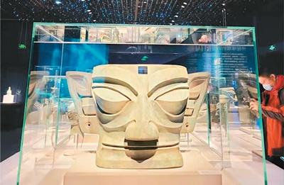 “巴蜀并辉”展厅的三星堆青铜大面具。刘裕国摄