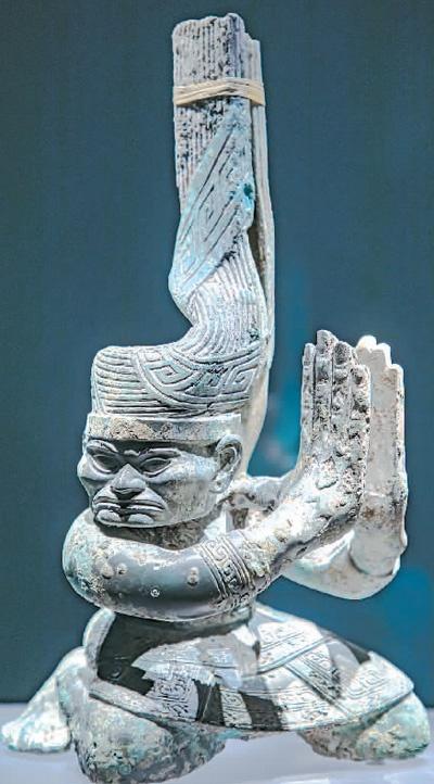 三星堆出土的扭头跪坐人铜像。刘骐恺摄