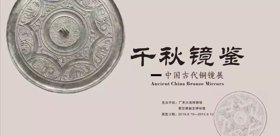 展览介绍:此次展览共展出广东大观博物馆藏铜镜136枚、拓片23件,年代跨越战国至唐代。通过多种纹饰和造型的铜镜,展览将引导观众鉴赏铜镜千余年间“美的历程”,探索中国古代铜镜文化及其内涵。