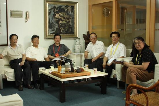 中国中小企业国际合作协会袁晋秘书长、中国中小企业国际合作协会企业信用与担保评价中心宋新力主任、《中国中小企业》杂志社林文滢付社长一行,来我文化部鉴定评估广东工作站调研。吕少民主任、温尚光总监、张优怀委员,分别向来宾介绍广东工作站的近期工作情况及“双百”(百名艺术家,百名企业家)活动准备情况。