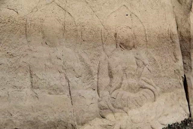 三座连排佛像每座高约1.5米、宽约0.9米,左边和中间的佛像的轮廓已经模糊,最右边的佛像可清晰看出身形和姿态。佛像上方的石壁上,不规则分布着圆形或方形的凿孔,可以看出这里是经人工修饰过的。“我在白河堡水库工作8年了,以前水库放水,这组石刻从没有露出来,我也是第一次看到。”顺着水库巡查员吕双利的指引,记者发现石刻左下边水线处,还有几个字迹清晰可辨,这应该是破解这组石刻身份的“密码”,目前区文物所正在对这组文字进行研究。