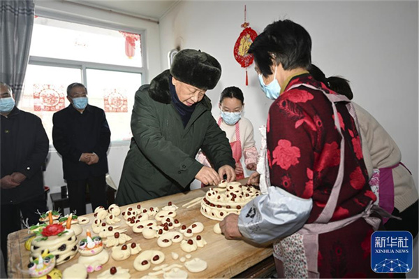 师红兵家4间窑洞去年因强降雨全部倒塌,在政府补助和各方援助下重建了2间装配式住房,目前全家已经入住。习近平仔细察看院落、住房。看到师红兵一家正在做年馍,习近平加入进来,捏了一个枣花,并为面团点上红枣。欢声笑语中,一个个年馍制作出来,格外喜庆。