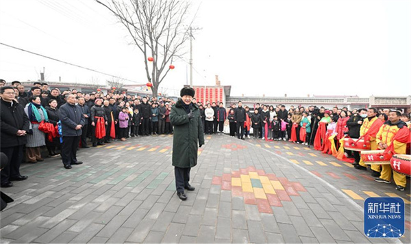 1月26日至27日,中共中央总书记、国家主席、中央军委主席习近平来到山西,看望慰问基层干部群众。这是26日下午,习近平在临汾市汾西县僧念镇段村文化广场,给乡亲们拜年,向全国各族人民、向港澳台同胞和海外侨胞致以美好的新春祝福。新华社记者 李学仁 摄