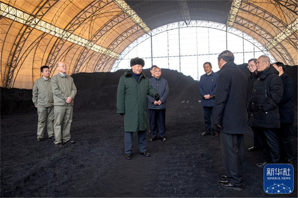 1月26日至27日,中共中央总书记、国家主席、中央军委主席习近平来到山西,看望慰问基层干部群众。这是27日下午,习近平在山西瑞光热电有限责任公司储煤场察看煤场储煤情况。新华社记者 谢环驰 摄