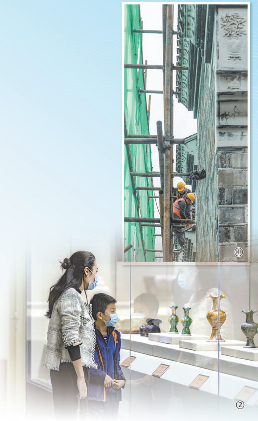 图① 湖北省宜昌市文物部门组织建筑工人对古建筑群进行防雷设施安装作业 王罡摄(人民视觉)