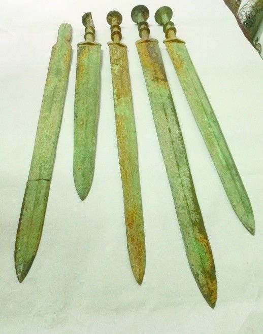 龙塘镇新石桥村56岁的村民李新定在湄水(新石桥段)河边放羊时,发现被洪水冲垮的田坎上五把古剑插在泥土里,他随即把古剑取出带回家中,并迅速向龙塘镇派出所报警。4月10日,涟源市委常委、宣传部长梁育清代表市委政府授予主动上交五件战国青铜剑文物的龙塘镇新石桥村村民李新定“涟源市文物保护功臣”称号,并按国家相关规定给予奖励。