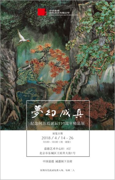 “梦幻成真——纪念何海霞诞辰110周年精品展”于2018年4月14日至2018年4月26日在北京嘉德艺术中心B1 A厅(北京市东城区王府井大街1号)举行。