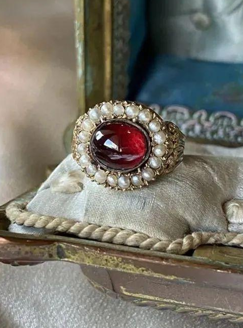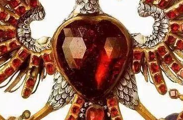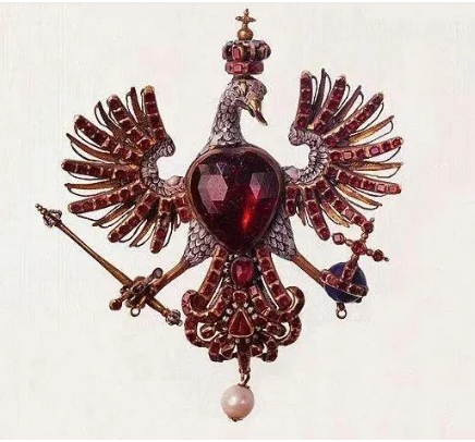 上面这件藏于卢浮宫曾被路易十四收藏的胸针,设计为雄鹰的形状,鹰身镶嵌了一颗巨大的石榴石,以38颗红宝石衬托,展现出王者的威严。