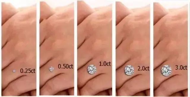 由于市场上绝大多数钻石都是标准圆钻型切工,所以根据克拉重量可以很直观的感受到钻石的大小,如下图所示: