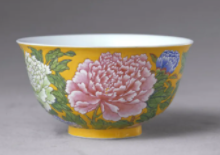 左:(清康熙)黄地珐琅彩牡丹纹碗, 故宫博物院藏 右:现代色地臆造品