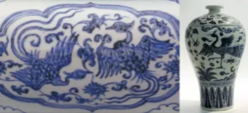 左:(明宣德)青花菱形开光双凤穿莲花纹长方炉(局部),故宫博物院藏 右:现代纹饰臆造品