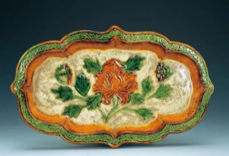 此件三彩釉印牡丹双蝶纹海棠式长盘,便是一件带有中原审美特征的辽代陶器。