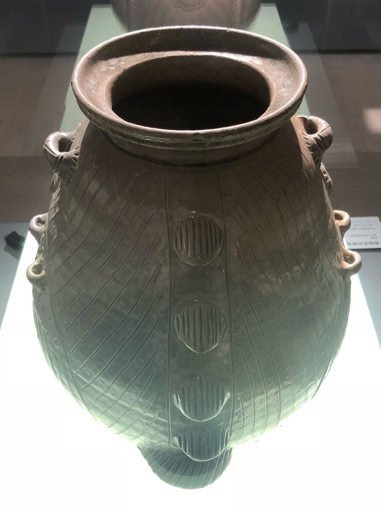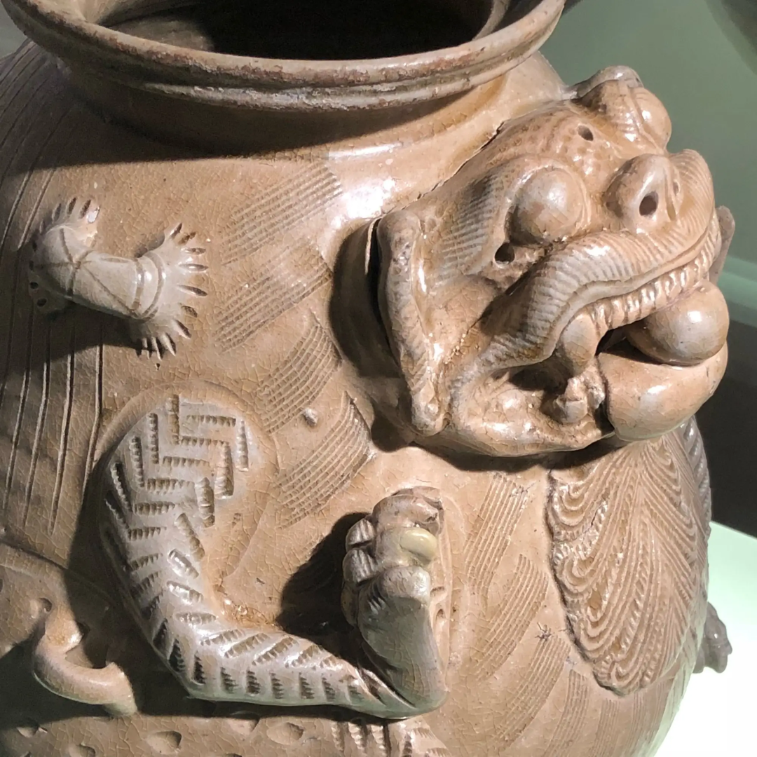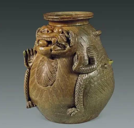 西晋·青釉神兽尊 口径13.2厘米,高27.9厘米,底径16厘米, 现藏于南京博物院。 该尊形为貔貅,其貔貅与尊混同一体,通体布满纹饰,造型夸张,设计风格独特。 貔貅头部雕刻得活灵活现,张口含珠,龇牙吐舌。其姿态抬手蹲坐,线条清晰简洁,胸前毛发为点睛之笔,器底部刻有“东州”二字。 尊背有横系,两侧各三只。 【器系】 陶瓷器上为了便于提携而用以穿绳系带的部件。多贴附在罐、壶等器物的肩部或腹部,与器壁间留有孔隙,体积较小。造型样式丰富,“横系”是其中的一种。 该作品整体结构完整,刻画细致传神,貔貅形象不墨守范式,而是融合了当时各种雕塑的神姿。反映了中国古代器物风格的多样性,展现出西晋工匠那天马行空的想象力和细致入微的创造力。 貔貅是中国古书记载和民间神话传说中的一种凶猛的瑞兽,与“龙”、“凤”、“龟”、“麒麟”并称为五大瑞兽。相传其身形如虎豹,其首尾似龙状,其色亦金亦玉。 因传有“辟邪”“镇宅”之效,貔貅在现代多为珠宝设计元素。在广东省湛江市吴川地区,每逢佳节或喜庆之日,人民群众还会跳起貔貅舞,以祈福驱邪、保佑平安。