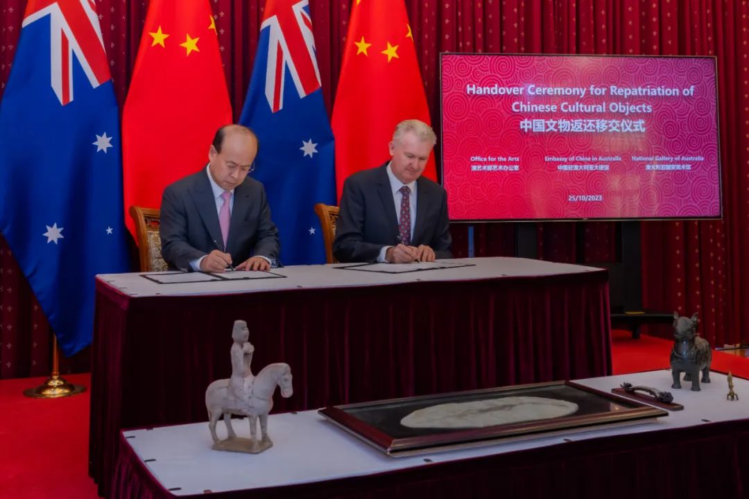 当地时间10月25日上午,经国家文物局授权,中国驻澳大利亚大使馆举行仪式,接收澳方向我国返还共4件流失文物艺术品与1件古生物化石。