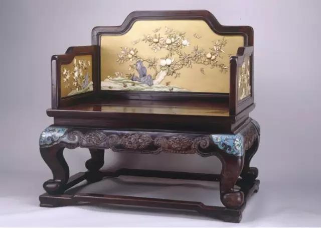 该宝座的制作年代应在清代中晚期。现藏于上海博物馆,保存较为完好,做工精细,所以这张宝座也稍稍会详细阐述。说其是清代中晚期,有三大论点可述:一是通体用红木制作,而红木(酸枝木)的使用一般来说自清代中期开始逐步流行起来;二是清代装饰工艺中的染牙比百宝嵌使用时间相对要晚,从传世实物看,这一工艺多见于清代中晚期;三是该椅三弯腿用材粗壮,特别是其足部十分臃肿,与清式家具早、中期三弯腿相比显得笨拙而无韵律,这是中国传统家具进入衰微时期出现的一种初步现象。从造型风格上说,该宝座做三屏风围子。后背搭脑部位形同罗锅枨,两侧至扶手依次递减。座屉硬板,下有束腰,牙条膨出,上开光内浮雕吉祥果。腿为三弯腿,肩部包裹铜掐丝珐琅。足下置罗锅枨式托泥。该宝座屏面贴金嵌染牙组成的寿桃、佛手、石榴,旁以蝙蝠衬托。整个画面金碧辉煌,富贵呈祥。清代家具的装饰名目繁多,其中十分重要的一条是望图附会,因物名而捏造物宜,这是民间习用的于法。就本椅而言,它取用的桃子、佛手、石榴与蝙蝠,是清代中期以后最流行、最典型的吉祥物题材。