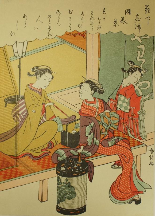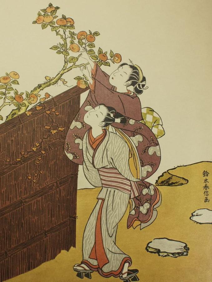 铃木春信,日本江户时代浮世绘画家。本名穗积次郎兵卫,号长荣轩。致力于锦绘(即彩色版画)创作,以描绘茶室女侍、售货女郎和艺妓为多。受中国明末清初“拱花”印法的影响,在拓印时往往压出一种浮雕式的印痕,自成风格,称为“春信式”。