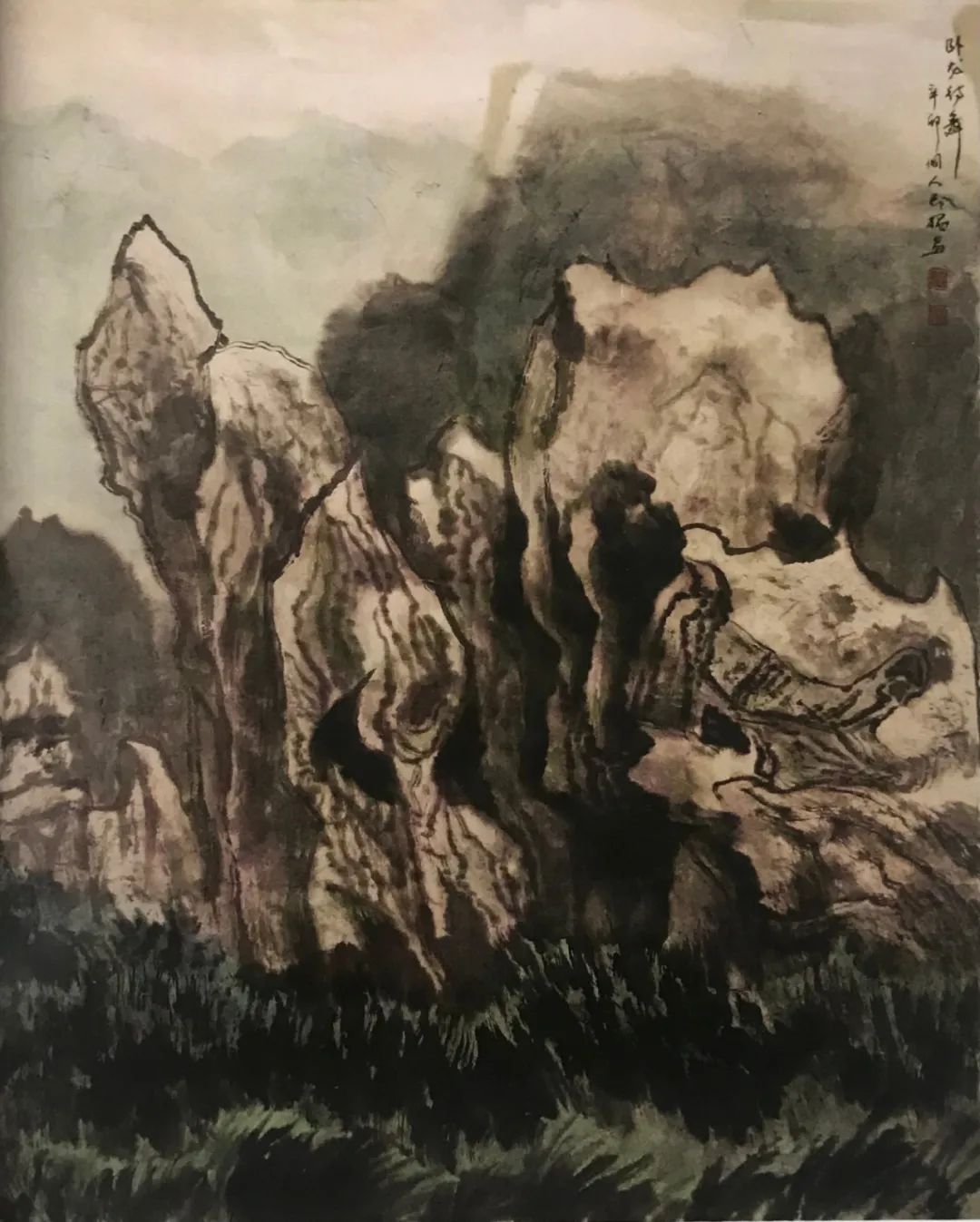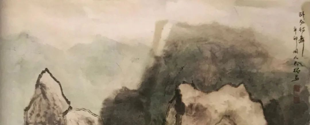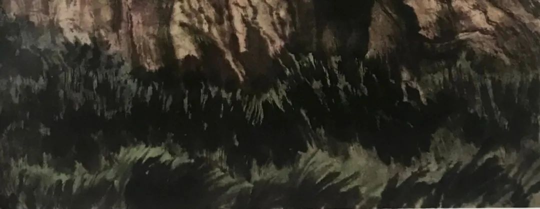 画面中心位置为两座山石,亦是“卧龙”盘踞之处。山石缝隙之处做墨层叠加晕染,淡墨推开,作有向背之分,其余则是留白处理,增添山石的立体感,另有细线湿笔勾勒山石边缘,虚实有度,使得山石更多几分嶙峋之感。