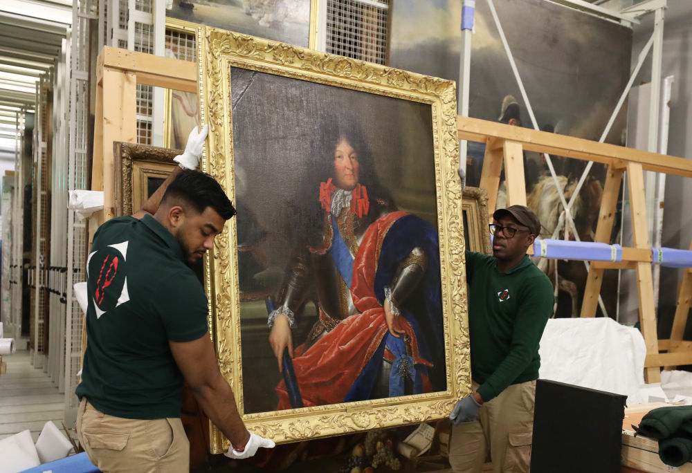 2024年3月11日,在法国巴黎近郊的凡尔赛宫,工作人员准备打包油画《路易十四戎装像》。在2024年中法建交60周年暨中法文化旅游年之际,凡尔赛宫和故宫博物院将于4月至6月在故宫共同举办“凡尔赛宫与紫禁城”展览。凡尔赛宫工作人员将70余件法方展品打包装箱,计划在不久之后将其运往北京。新华社记者 高静/摄