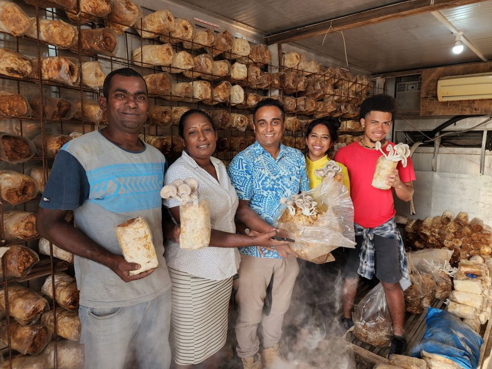 2022年5月11日,在斐济第三大城市楠迪,一家斐济蘑菇公司员工展示在中国援斐菌草技术示范中心项目帮助下种植的蘑菇。新华社记者 张永兴/摄